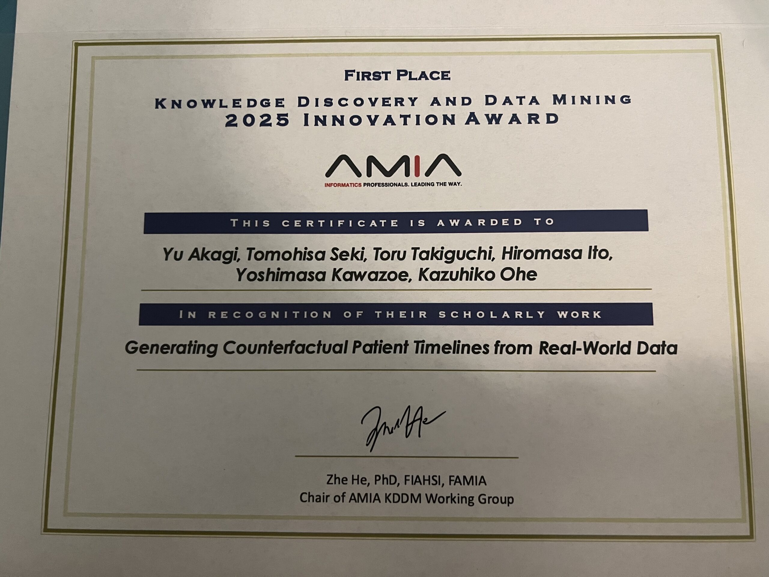 大学院生の赤木雄さんが米国アトランタで開催されたAMIA 2025 Annual Symposiumにおいて口演発表を行い、KDDM 2025 Innovation AwardのFirst Placeを受賞しました。Akagi Y, Seki T, Takiguchi T, Ito H, Kawazoe Y, Ohe K. Generating Counterfactual Patient Timelines from Real-World Data. AMIA Annu Symp Proc. 2025 Nov 18; 2025.